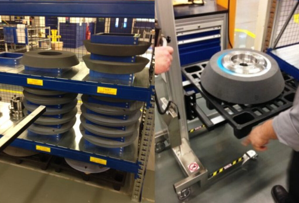 An application was required in their Bradford operation to retrieve grinding discs from a racking area with three shelves. Each grinding disc has a 500mm diameter and weighs between 40kg and 55kg. Each of these is required to be moved over to a workbench which is set at 90 degrees to the racking to allow operatives to build up the final assembly.
